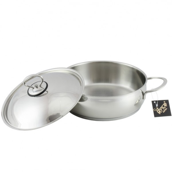 Толстое трехслойное дно. Для того чтобы обеспечить возможность комфортного использования кастрюли без пригорания продуктов, в частности густых блюд (каш, варенья), необходимо обеспечить хорошее распределение тепла от источника нагрева по всему дну кастрюли. Для этого в дно посуды помещается алюминиевый диск, ведь алюминий имеет гораздо лучшую теплопроводность, чем нержавеющая сталь. В посуде «КУХАР» части дна скрепляются между собой методом диффузионной сварки, что позволяет избежать образования полостей по краям дна и попадания туда воды и грязи.