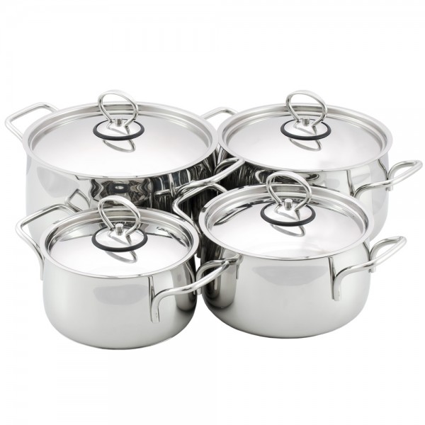 Набор «КУХАР»®. Кастрюли:1,6/2,3/3,5/4,5л.. Толщина стенок 0.8мм. Толщина дна 6.3мм.
