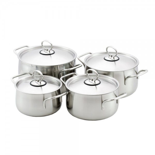 Набор «КУХАР»®. Кастрюли:1,6/2,3/3,5/4,5л.. Толщина стенок 0.8мм. Толщина дна 6.3мм, матовая внешняя полировка.